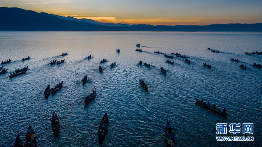 12月25日,漁船駛?cè)胄窃坪o人機(jī)拍攝)。當(dāng)日,位于云南省玉溪市江川區(qū)的星云湖迎來一年一度的開湖捕魚季,600余艘漁船駛?cè)胄窃坪稉啤P窃坪窃颇鲜【糯蟾咴粗?,本次開湖捕魚時間將從2019年12月25日持續(xù)至2020年1月23日。新華社記者胡超攝