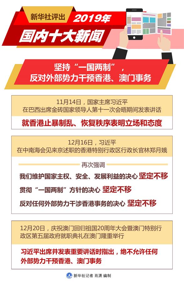 11月14日,國家主席習(xí)近平在巴西出席金磚國家領(lǐng)導(dǎo)人第十一次會晤期間發(fā)表講話,就香港止暴制亂、恢復(fù)秩序表明立場和態(tài)度。12月16日,習(xí)近平在中南海會見來京述職的香港特別行政區(qū)行政長官林鄭月娥,再次強調(diào)我們維護(hù)國家主權(quán)、安全、發(fā)展利益的決心堅定不移,貫徹“一國兩制”方針的決心堅定不移,反對任何外部勢力干涉香港事務(wù)的決心堅定不移。12月20日,慶祝澳門回歸祖國20周年大會暨澳門特別行政區(qū)第五屆政府就職典禮在澳門隆重舉行,習(xí)近平出席并發(fā)表重要講話時指出,絕不允許任何外部勢力干預(yù)香港、澳門事務(wù)。