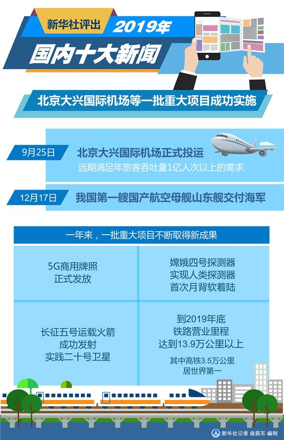 9月25日,北京大興國際機場正式投運,遠(yuǎn)期滿足年旅客吞吐量1億人次以上的需求。12月17日,我國第一艘國產(chǎn)航空母艦山東艦交付海軍。一年來,一批重大項目不斷取得新成果:5G商用牌照正式發(fā)放;嫦娥四號探測器實現(xiàn)人類探測器首次月背軟著陸;長征五號運載火箭成功發(fā)射實踐二十號衛(wèi)星;到今年底,鐵路營業(yè)里程達(dá)到13.9萬公里以上,其中高鐵3.5萬公里,居世界第一。