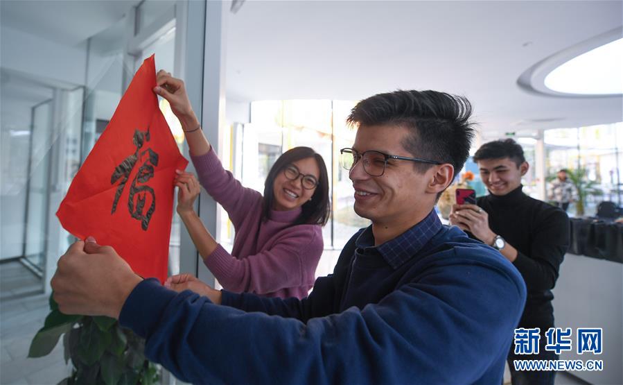 12月27日,來自俄羅斯的留學生阿布(中)在瓜山新苑社區(qū)活動中心與中國青年一起貼福字。新華社記者 徐昱 攝