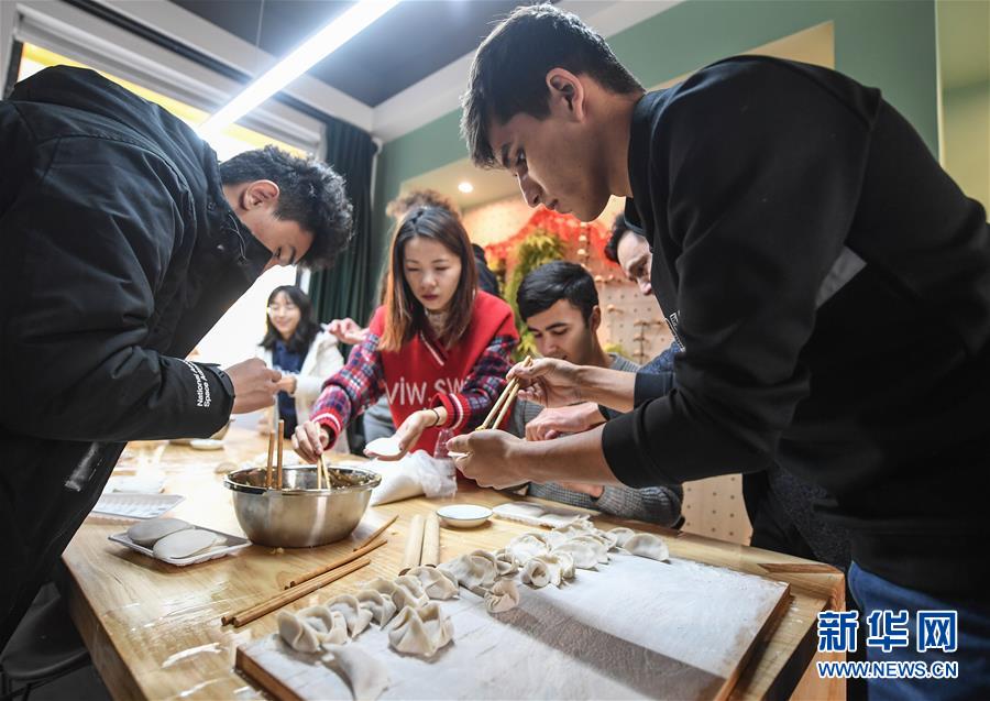 12月27日,中外青年在瓜山新苑社區(qū)活動中心參加迎新年活動,一起包餃子。新華社記者 徐昱 攝