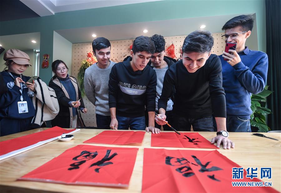 12月27日,外國留學生在瓜山新苑社區(qū)活動中心參加迎新年活動,學習用毛筆寫福字。新華社記者 徐昱 攝