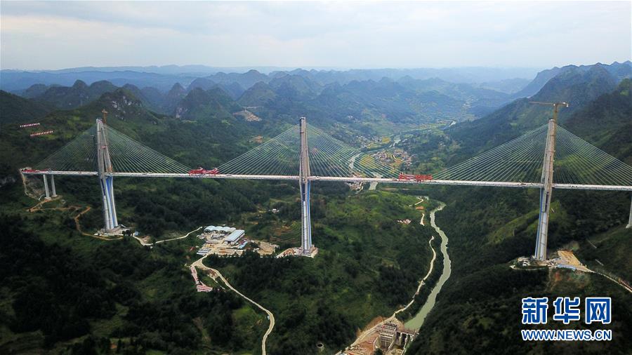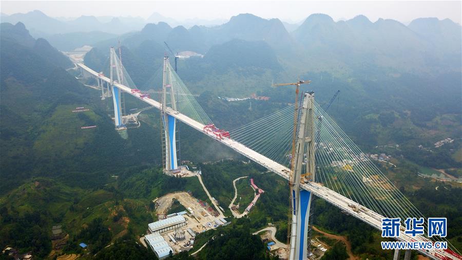 這是正在澆筑最后一方混凝土的平塘特大橋(9月26日無人機拍攝)。新華社記者陶亮攝
