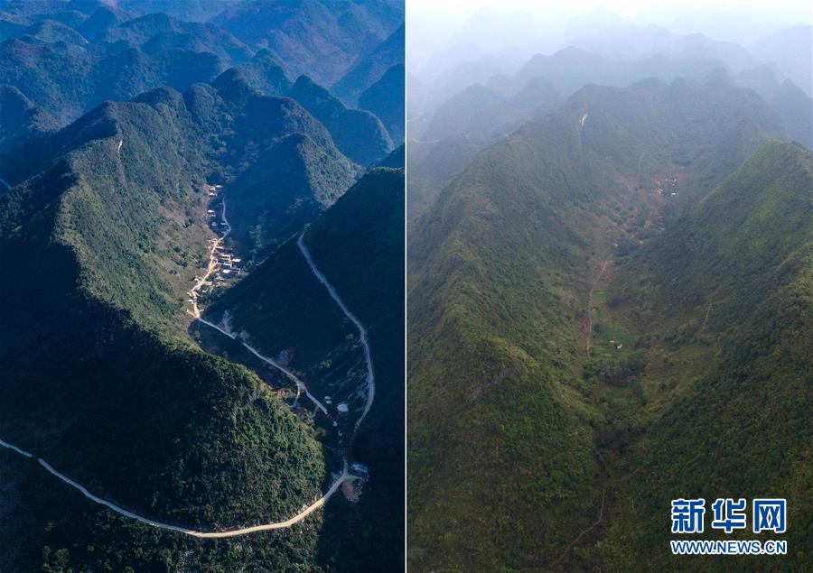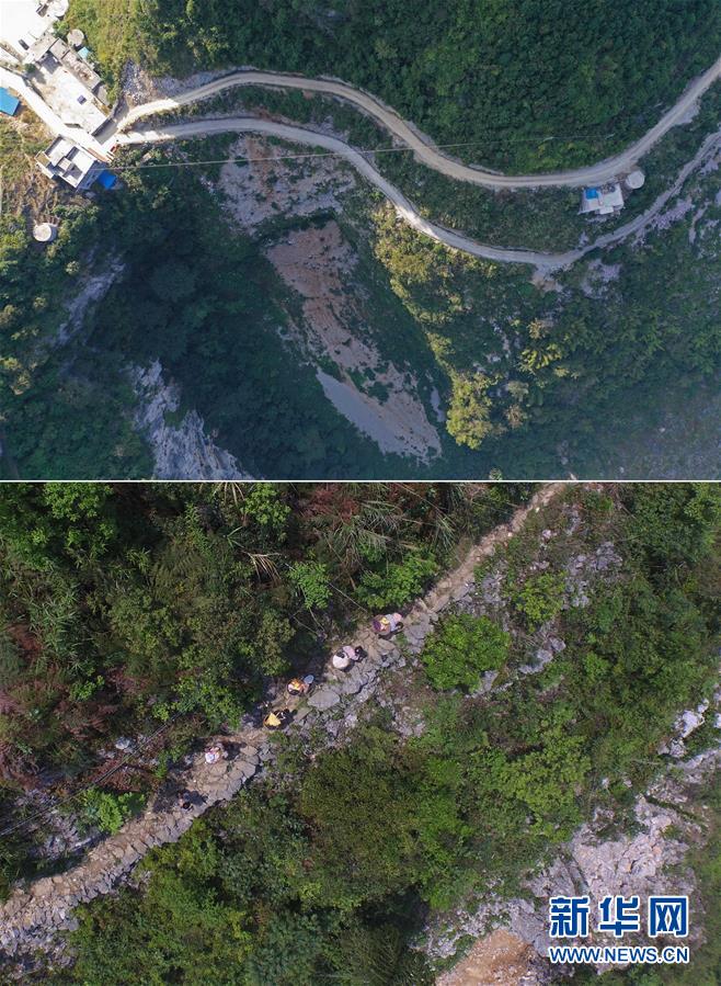 拼版照片:上圖為剛剛修通公路的大化瑤族自治縣板升鄉(xiāng)八好村弄麻屯(11月11日無人機(jī)拍攝);下圖為在尚未通路的八好村弄麻屯,孩子們爬山路回家(2016年9月23日攝)。新華社記者黃孝邦攝