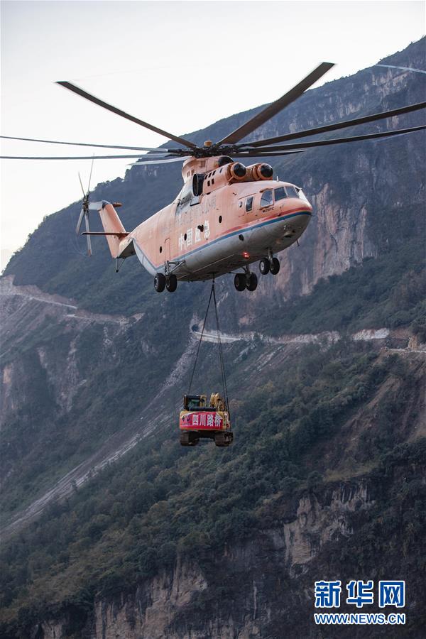 米-26重型直升機(jī)吊運(yùn)一臺挖掘機(jī)飛抵阿布洛哈村上空(2019年12月3日攝)。通村公路的施工單位四川路橋租用一架米-26重型運(yùn)輸直升機(jī),克服高山峽谷、天氣多變等不利因素,從布拖縣城吊運(yùn)大型施工設(shè)備到阿布洛哈村,為兩邊分頭掘進(jìn)施工提供大型機(jī)械保障。新華社記者江宏景攝