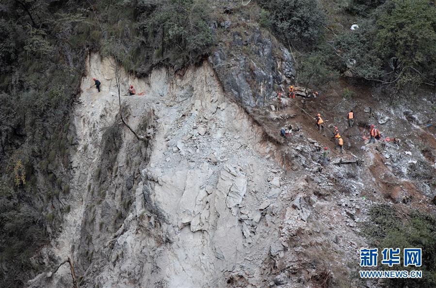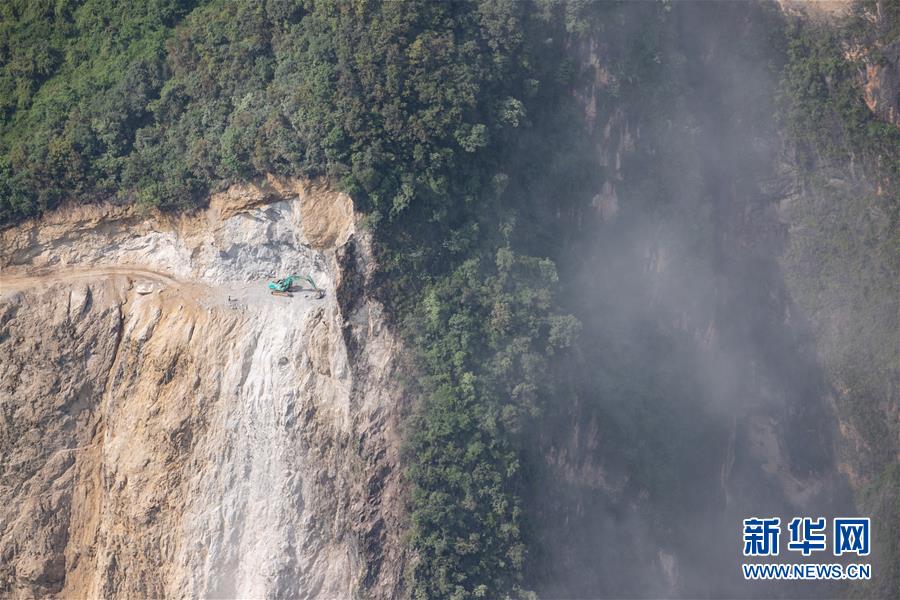 阿布洛哈村通村公路施工遇到陡崖夾溝地勢,項(xiàng)目進(jìn)程艱難緩慢,四川路橋施工隊(duì)伍開始在峽谷兩邊分頭推進(jìn)(2019年11月20日攝)。新華社記者江宏景攝