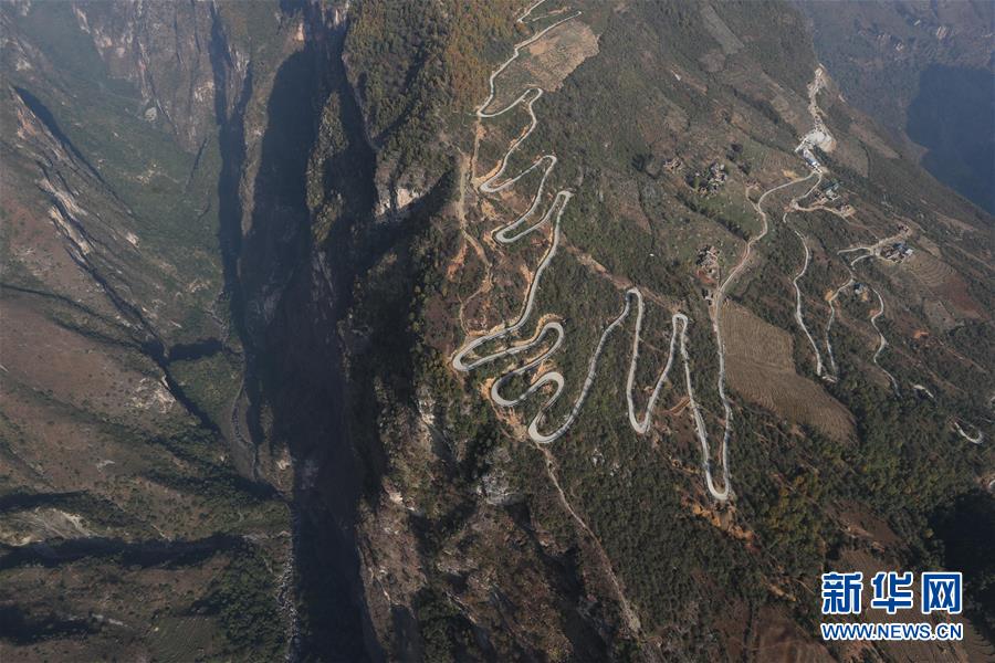 俯瞰布拖縣烏依鄉(xiāng)阿布洛哈村通村公路的起點(diǎn)拉果鄉(xiāng)偉木村。從拉果鄉(xiāng)政府到阿布洛哈村通村公路的起點(diǎn)位置要經(jīng)過54個(gè)回頭彎(2019年12月7日攝)。新華社記者江宏景攝