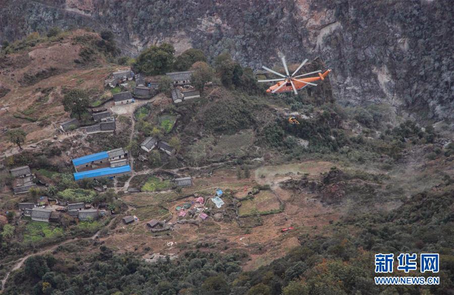 米-26重型直升機(jī)吊運(yùn)一臺挖掘機(jī)飛抵阿布洛哈村上空(2019年12月5日攝)。通村公路的施工單位四川路橋租用一架米-26重型運(yùn)輸直升機(jī),克服高山峽谷、天氣多變等不利因素,從布拖縣城吊運(yùn)大型施工設(shè)備到阿布洛哈村,為兩邊分頭掘進(jìn)施工提供大型機(jī)械保障。新華社記者江宏景攝