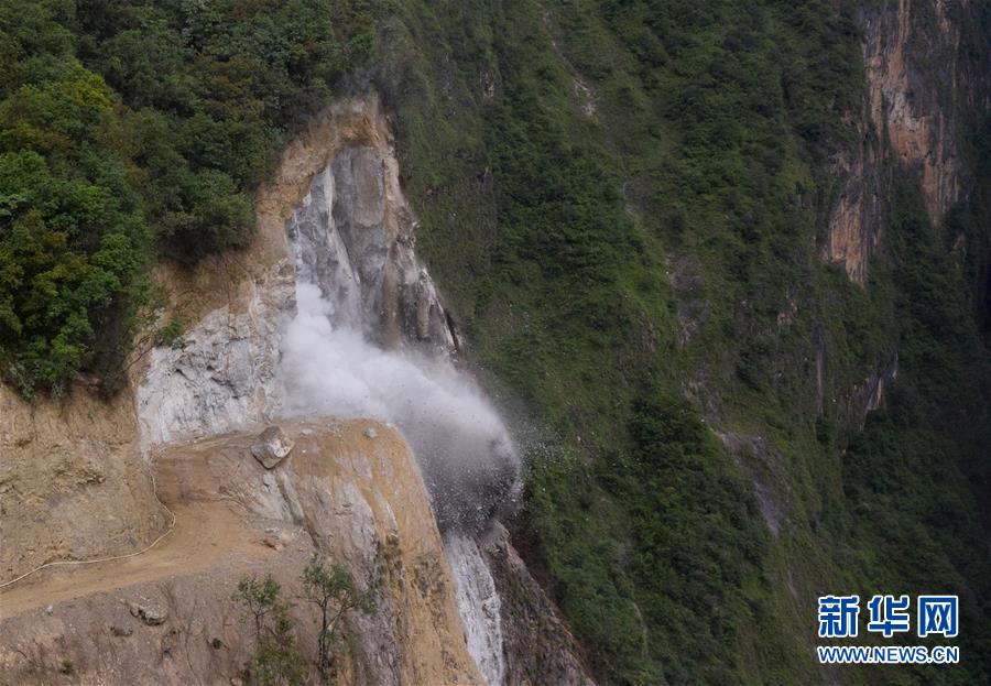 阿布洛哈村通村公路施工中進(jìn)行的一次爆破(2019年7月18日攝)。在該公路修建中遇到陡崖夾溝地勢時(shí),施工人員有時(shí)一天要進(jìn)行10余次爆破。新華社記者江宏景攝