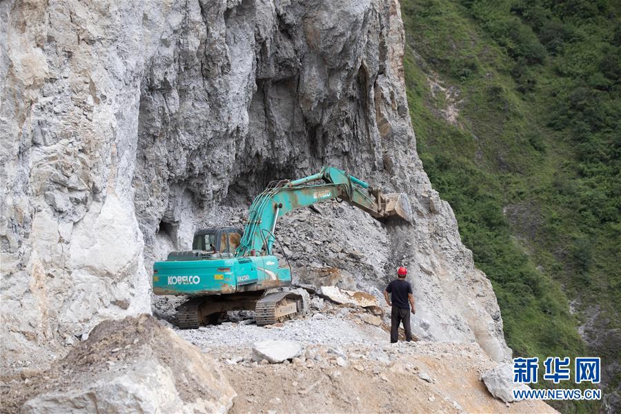 一輛挖掘機(jī)在阿布洛哈村懸崖修建通村公路(2019年7月18日攝)。新華社記者江宏景攝