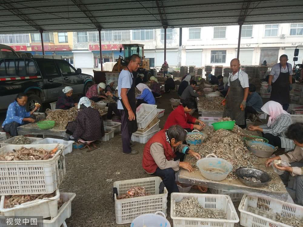 2019年9月13日,農(nóng)歷八月十五中秋節(jié),山東濱州沾化區(qū)魯北海產(chǎn)品批發(fā)市場(chǎng),村民正在分揀貨物。