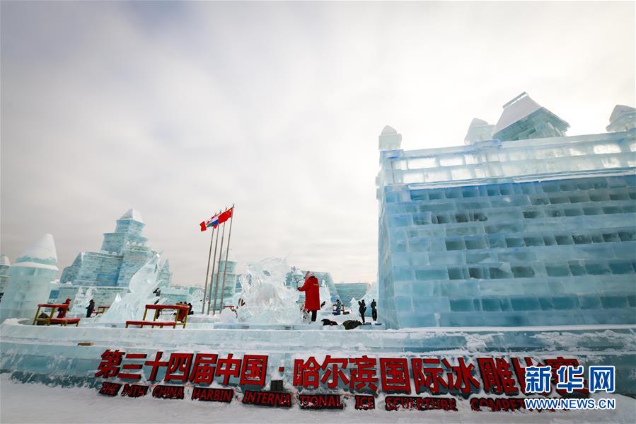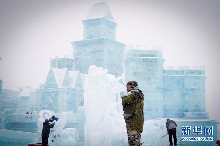 選手在第九屆中國(guó)·哈爾濱國(guó)際組合冰雕比賽中進(jìn)行冰雕創(chuàng)作(2019年12月31日攝)。新華社記者王松攝