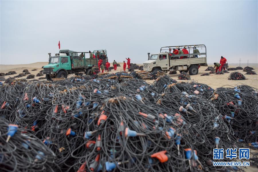 1月14日,放線工在出工前將一捆捆檢波器裝車。地球物理勘探是油氣開發(fā)的第一步,相當(dāng)于給地球做CT。物探工人按照嚴(yán)格的測線部署,在相應(yīng)位置鉆井,然后實施地震,采集地震波數(shù)據(jù)??蒲腥藛T通過數(shù)據(jù)組成的“CT片”,就能夠清晰地“看”到地下的地質(zhì)結(jié)構(gòu),判斷哪里埋藏有石油或者天然氣。2019年10月,東方地球物理勘探有限責(zé)任公司塔里木物探處2113隊進(jìn)入新疆塔克拉瑪干沙漠腹地,開始中古14-21、塔中2兩個區(qū)塊的三維地震勘探。近2000名物探工人將在1000平方公里的范圍內(nèi)一直工作到2020年4月,這也意味著他們將在塔克拉瑪干沙漠腹地連續(xù)度過第14個除夕夜。蘊(yùn)藏著豐富石油天然氣資源的新疆塔克拉瑪干沙漠有“死亡之?!敝Q,氣候干燥,年降水量在50毫米以下,冬季地表最低溫度超過零下30攝氏度,是世界油氣勘探難度最大的地區(qū)之一。為避開風(fēng)季,物探工人每年9、10月份進(jìn)入沙漠,一直工作到來年4月,夜以繼日與黃沙、嚴(yán)寒為伴,用辛勤的汗水,為祖國找油找氣。新華社記者丁磊攝