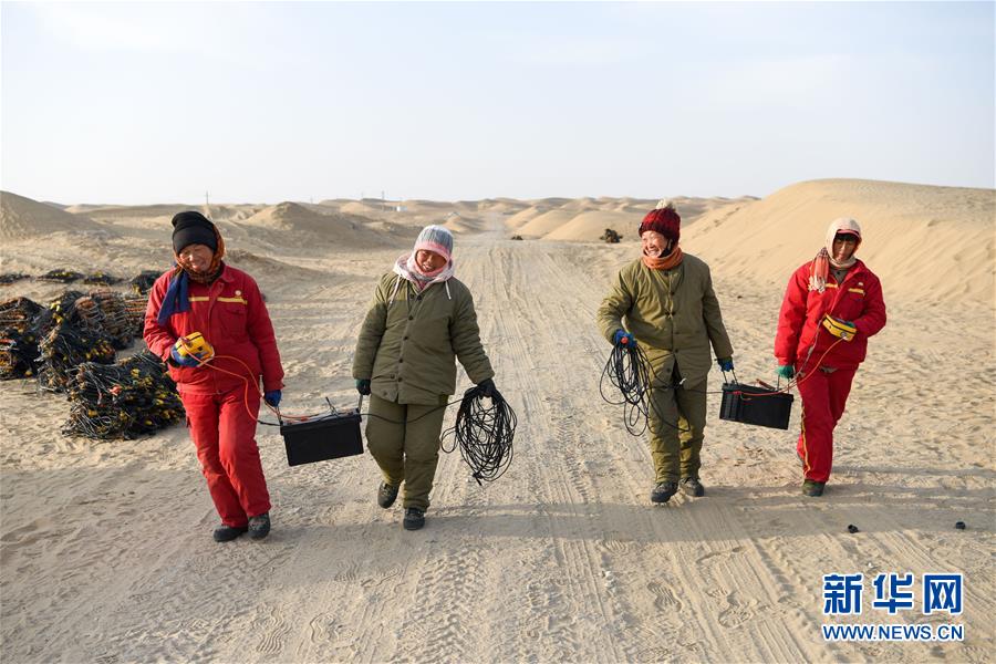 1月14日,4名測線女工抬著電瓶返回營地。地球物理勘探是油氣開發(fā)的第一步,相當(dāng)于給地球做CT。物探工人按照嚴(yán)格的測線部署,在相應(yīng)位置鉆井,然后實施地震,采集地震波數(shù)據(jù)。科研人員通過數(shù)據(jù)組成的“CT片”,就能夠清晰地“看”到地下的地質(zhì)結(jié)構(gòu),判斷哪里埋藏有石油或者天然氣。2019年10月,東方地球物理勘探有限責(zé)任公司塔里木物探處2113隊進(jìn)入新疆塔克拉瑪干沙漠腹地,開始中古14-21、塔中2兩個區(qū)塊的三維地震勘探。近2000名物探工人將在1000平方公里的范圍內(nèi)一直工作到2020年4月,這也意味著他們將在塔克拉瑪干沙漠腹地連續(xù)度過第14個除夕夜。蘊(yùn)藏著豐富石油天然氣資源的新疆塔克拉瑪干沙漠有“死亡之海”之稱,氣候干燥,年降水量在50毫米以下,冬季地表最低溫度超過零下30攝氏度,是世界油氣勘探難度最大的地區(qū)之一。為避開風(fēng)季,物探工人每年9、10月份進(jìn)入沙漠,一直工作到來年4月,夜以繼日與黃沙、嚴(yán)寒為伴,用辛勤的汗水,為祖國找油找氣。新華社記者丁磊攝