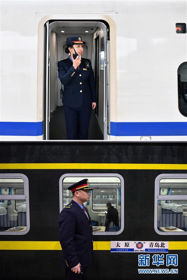 拼版照片左圖:在臨汾西站,列車長陳海燕通過對講機(jī)了解各個(gè)車廂的上車情況(新華社記者詹彥1月11日攝);右圖:在太原開往青島北的K884次列車上,列車長趙耀通過對講機(jī)了解各個(gè)車廂的情況(新華社記者楊晨光1月11日攝)。
