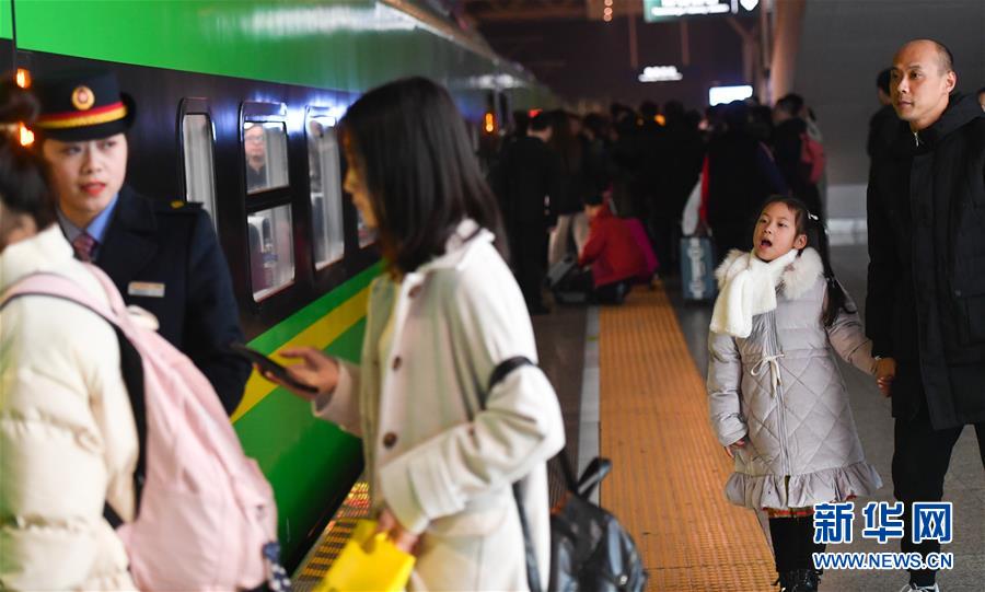 1月3日,卞菁值乘的動車到站,朱梓芮(前右)和父親尋找卞菁的身影。新華社記者 胡晨歡 攝