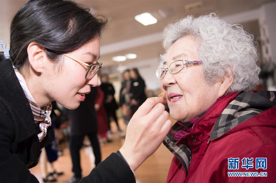1月17日,張丹俠(左)為前去報名參加杭州市社會福利中心模特隊的王育華涂口紅。新華社記者 翁忻旸 攝