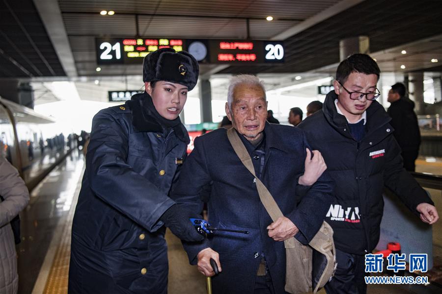 吉如(左一)在西安北站的站臺上協(xié)助旅客乘降,確保旅客安全乘車(1月14日攝)。今年春運列車開行密度大,站臺崗位人員緊張,吉如時常被調(diào)到站臺進行站臺服務(wù)工作。新華社記者陶明攝