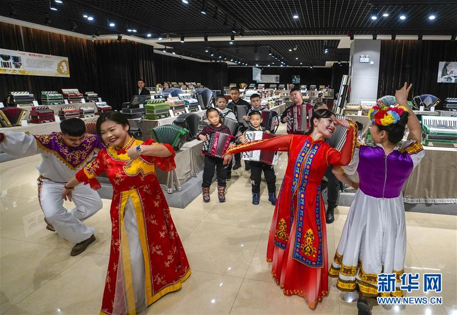 在塔城市手風琴博物館,文藝工作者在手風琴伴奏中表演《黑走馬》(1月21日攝)。