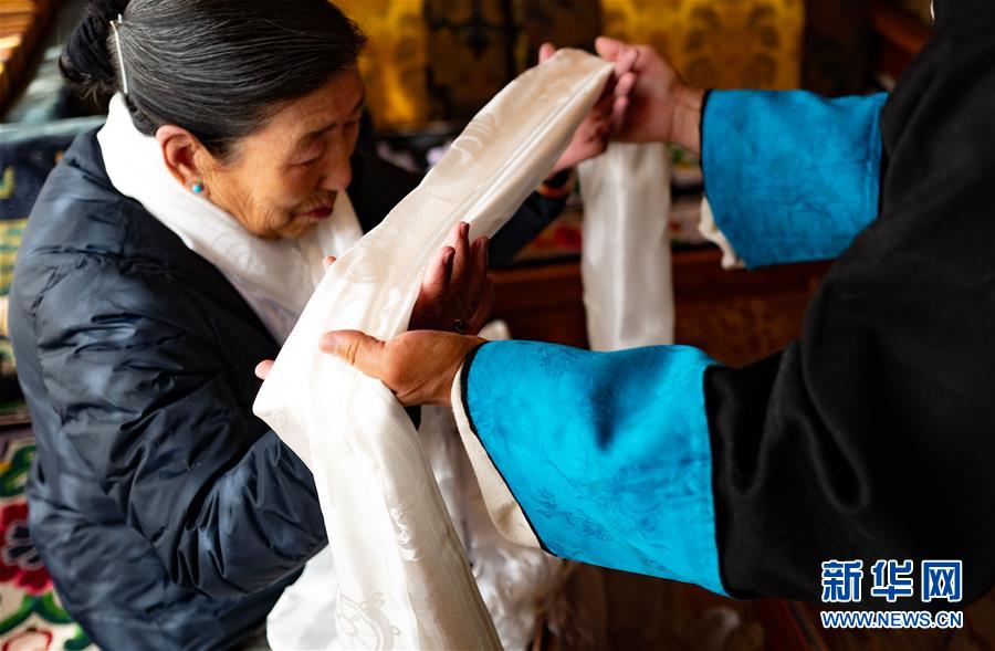 一名藏族群眾給長輩敬獻哈達,祝福長壽(2月24日攝)。 新華社記者 普布扎西 攝