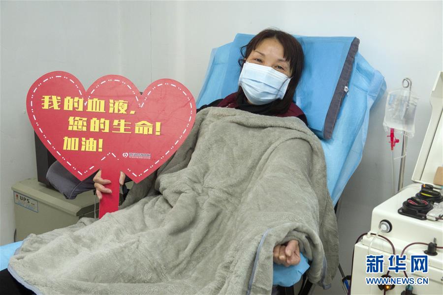 在武漢血液中心的中國(guó)醫(yī)學(xué)科學(xué)院CPnCoV項(xiàng)目組,康復(fù)病人、來(lái)自漢口醫(yī)院的護(hù)士蔡桃英在獻(xiàn)血漿時(shí)拍照留念。她說(shuō)同事們都在一線忙碌,她獻(xiàn)血漿后,再休息幾天就準(zhǔn)備回到崗位上班,她說(shuō)自己感染是由于早期防護(hù)不足經(jīng)驗(yàn)不夠造成的,再次回到工作崗位一定沒(méi)有問(wèn)題(2月17日攝)。 新華社記者 才揚(yáng) 攝