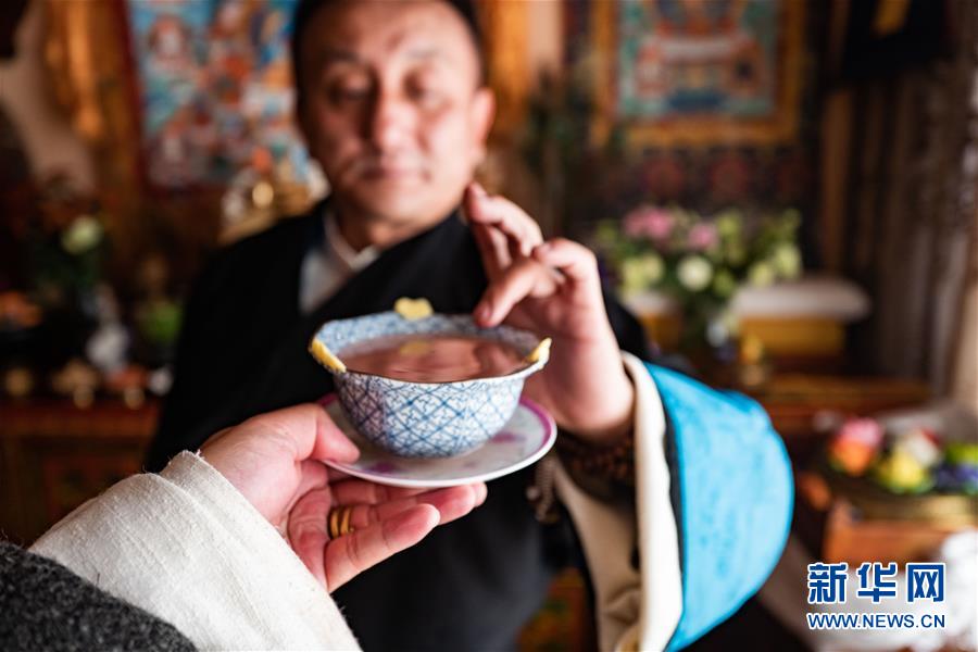 一名拉薩市民在進行品嘗青稞酒前的儀式(2月24日攝)。新華社記者普布扎西攝