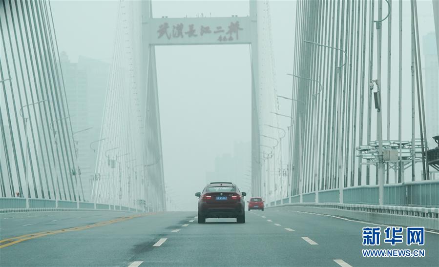 2月26日,劉女士開(kāi)車送餐經(jīng)過(guò)武漢長(zhǎng)江二橋。新華社記者程敏攝