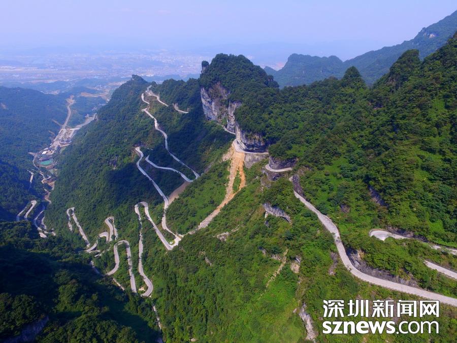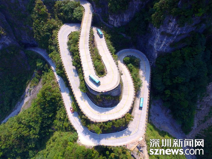 天門山盤山公路位于湖南省張家界市境內(nèi)的國家森林公園天門山上,盤山公路全長10.77公里,海拔從200米急劇提升到1300米,大道兩側(cè)絕壁千仞,空谷幽深,共計(jì)99個(gè)彎,180度急彎此消彼長,似玉帶環(huán)繞,航拍鏡頭下蜿蜒曲折的道路彎彎緊連,層層迭起,宛如迷宮般的“納斯卡線條”,被譽(yù)為“天下第一公路奇觀”,同時(shí)它也是世界上最危險(xiǎn)的十大公路之一。