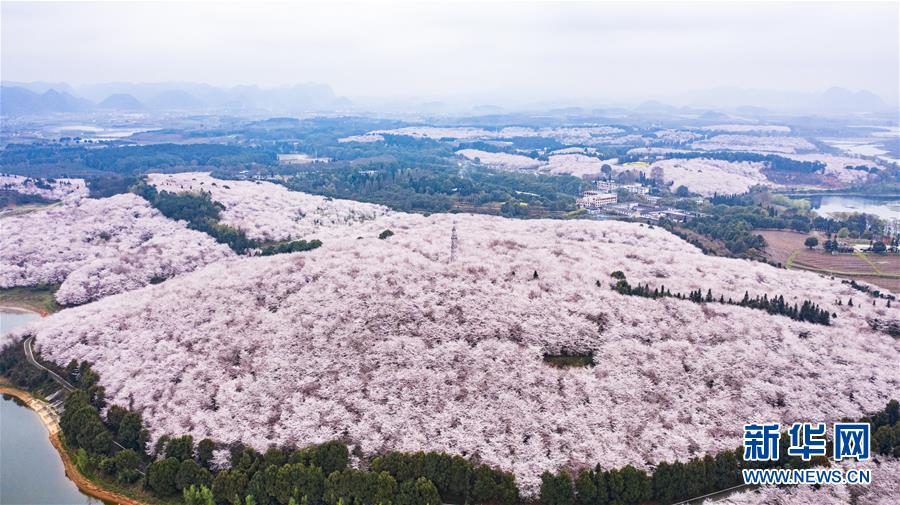 3月12日拍攝的貴安新區(qū)櫻花觀光園風景(無人機照片)。 近日,貴州省貴安新區(qū)櫻花觀光園內(nèi)櫻花競相盛開,花團錦簇間春意盎然。據(jù)介紹,疫情防控期間,為避免人群聚集,櫻花園暫不接待游客。 新華社記者 陶亮 攝