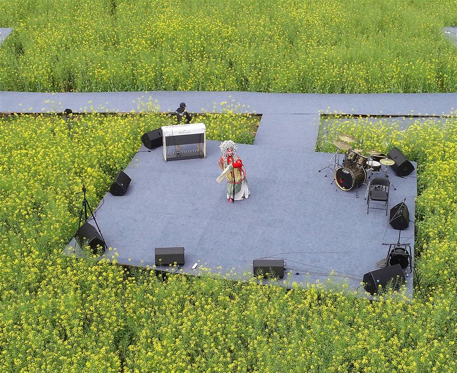 3月16日,演員在李坑村的“花田音樂(lè)會(huì)”上表演戲曲(無(wú)人機(jī)照片)。 新華社記者 萬(wàn)象 攝