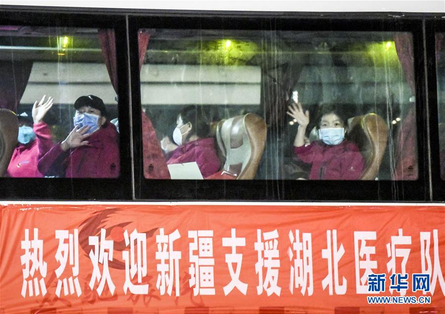 3月17日,在新疆烏魯木齊地窩堡國(guó)際機(jī)場(chǎng),醫(yī)療隊(duì)隊(duì)員坐上大巴車準(zhǔn)備離開。新華社記者王菲攝