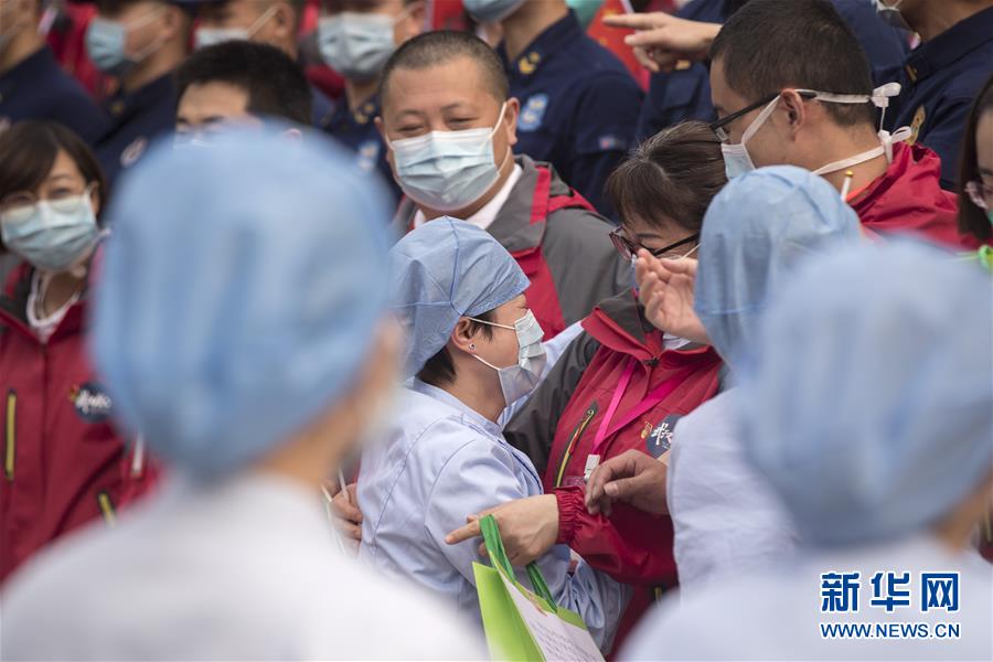 3月21日,武漢市第一醫(yī)院的醫(yī)護(hù)人員(前)送別天津市醫(yī)療隊(duì)隊(duì)員。新華社記者費(fèi)茂華攝
