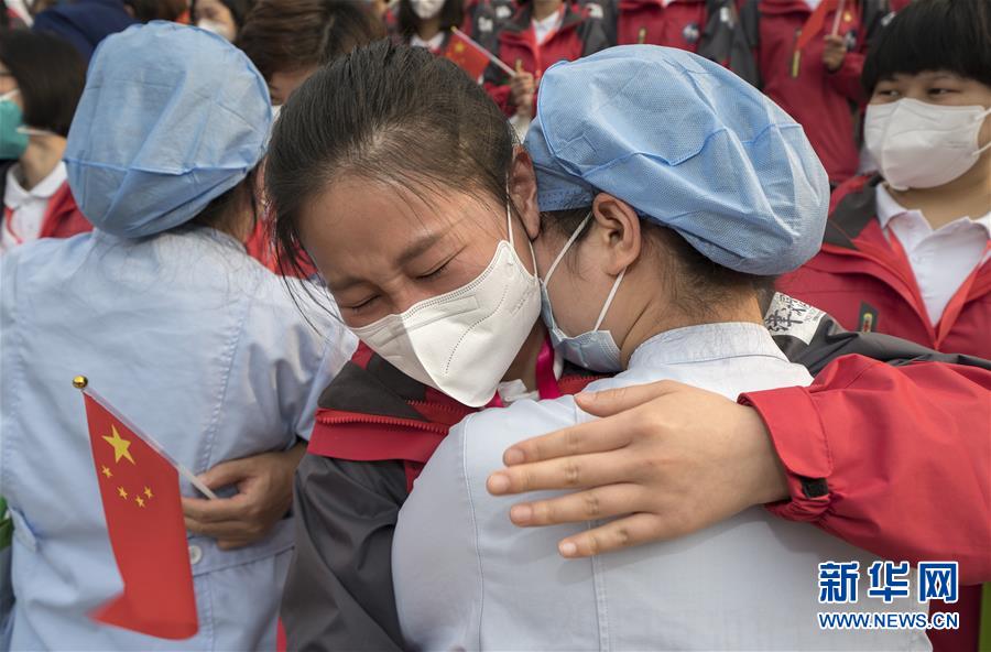 3月21日,武漢市第一醫(yī)院的醫(yī)護(hù)人員(前)與天津市醫(yī)療隊(duì)隊(duì)員李梅擁抱道別。新華社記者費(fèi)茂華攝