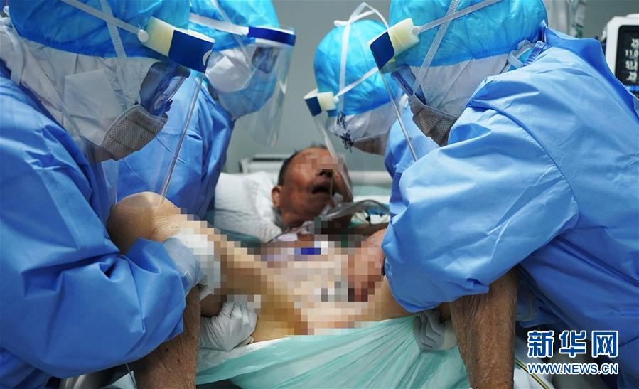 四名護(hù)士一起調(diào)整患者的身體姿態(tài)(3月20日攝)。 武漢火神山醫(yī)院重癥醫(yī)學(xué)一科的護(hù)理團(tuán)隊(duì)共50名護(hù)士,其中絕大多數(shù)是80后、90后女性,她們不懼危險,奮戰(zhàn)在抗擊疫情的最前沿“紅區(qū)”。 新華社記者王毓國攝