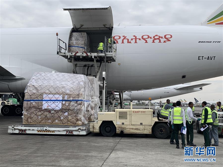 3月22日,在埃塞俄比亞首都亞的斯亞貝巴國(guó)際機(jī)場(chǎng),工作人員將中國(guó)援助的抗疫物資運(yùn)下飛機(jī)。歷時(shí)10小時(shí)飛行,滿載著來(lái)自中國(guó)抗疫物資的埃航貨運(yùn)包機(jī)22日上午抵達(dá)埃塞俄比亞首都亞的斯亞貝巴的國(guó)際機(jī)場(chǎng),這是馬云公益基金會(huì)和阿里巴巴公益基金會(huì)捐贈(zèng)非洲的部分醫(yī)療物資,用于支援非洲54國(guó)抗擊疫情。新華社記者王守寶攝