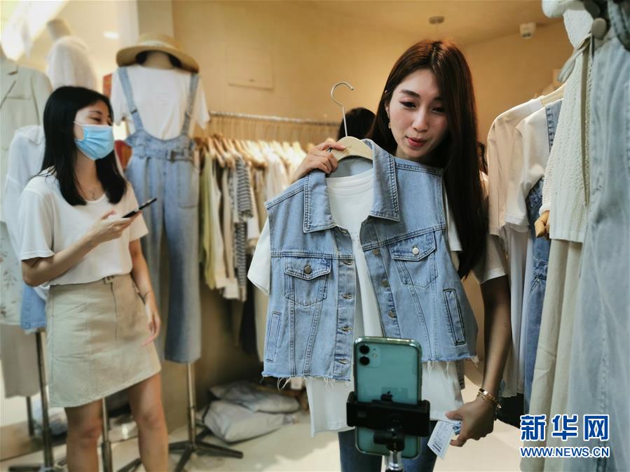 在廣州市新中國大廈內(nèi),一家服裝檔口的員工在用手機進(jìn)行直播(3月21日攝)。新華社記者胡林果攝