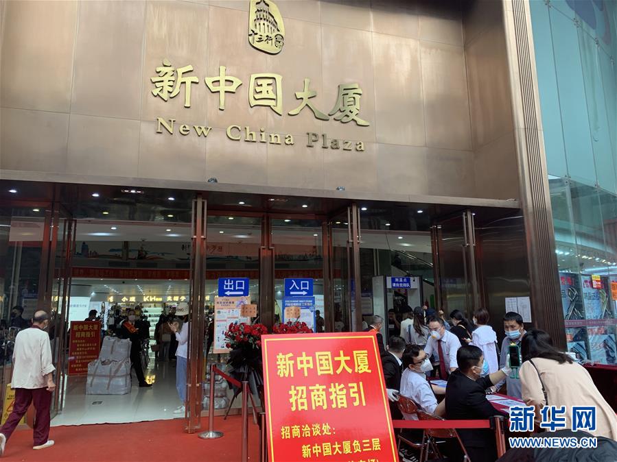 在廣州市新中國大廈門口,顧客排隊(duì)進(jìn)行安全檢查(3月21日攝)。新華社記者周穎攝