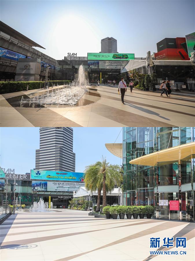 這是3月21日拍攝的泰國(guó)曼谷暹羅廣場(chǎng)(上圖)和3月22日拍攝的空無一人的廣場(chǎng)的對(duì)比圖。新華社記者張可任攝