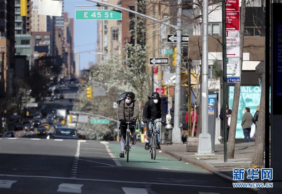 3月21日,在美國紐約第二大道,人們戴口罩騎車出行。美國紐約州、伊利諾伊州、康涅狄格州20日發(fā)布針對本州居民的“居家令”,以遏制新冠病毒傳播。這些“居家令”涵蓋紐約、洛杉磯、芝加哥等大城市,影響數(shù)千萬人。白宮20日發(fā)表聲明說,總統(tǒng)特朗普已宣布紐約州出現(xiàn)“重大災(zāi)難”,命令聯(lián)邦政府支援該州抗擊新冠肺炎疫情。新華社記者王迎攝
