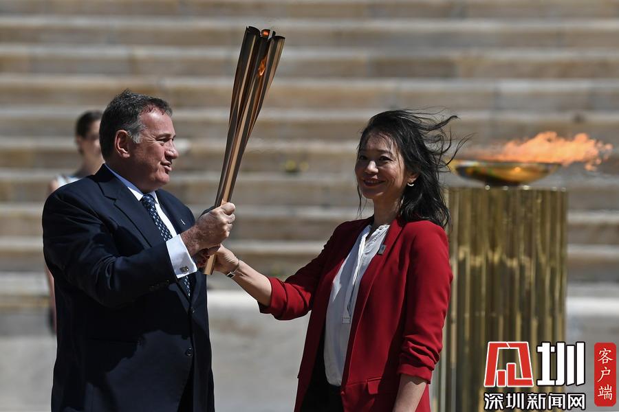 3月19日,日本代表團(tuán)成員井本直步子(右)從希臘奧委會(huì)主席斯皮羅斯·卡普拉洛斯手中接過(guò)東京奧運(yùn)會(huì)圣火火炬。