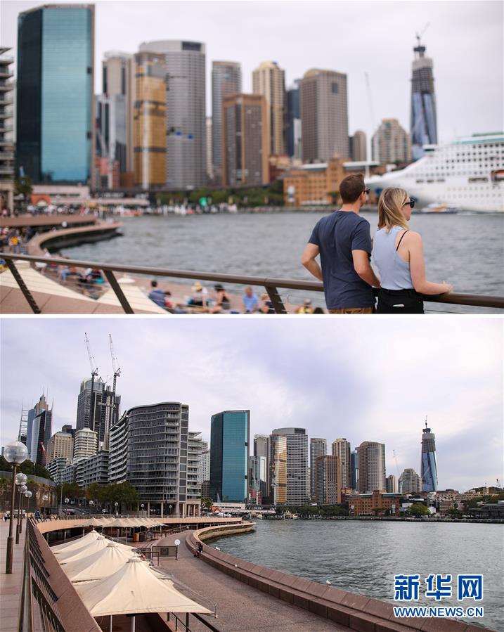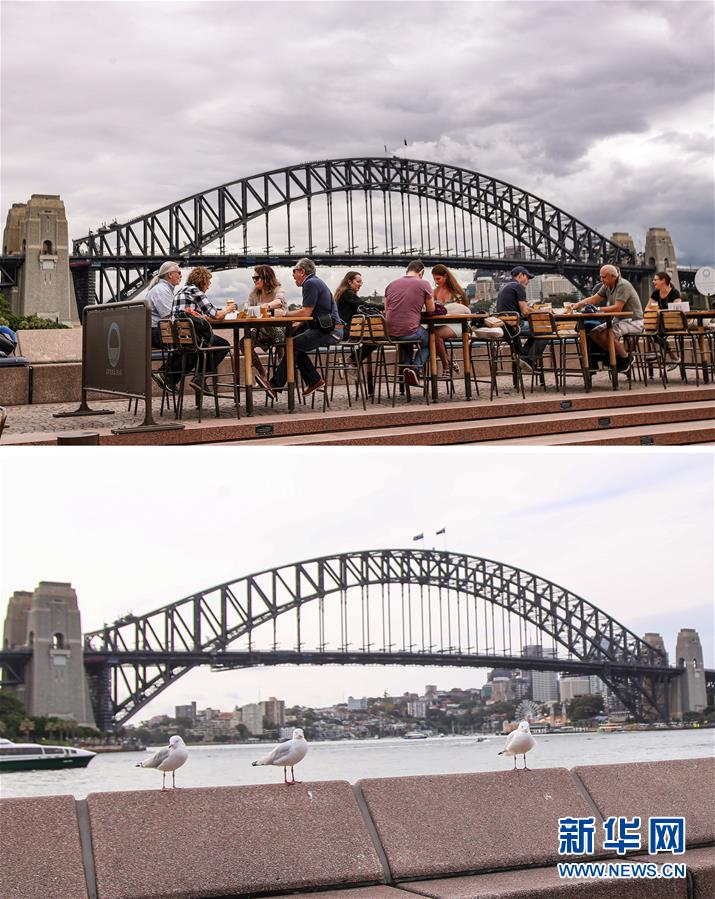 拼版照片顯示:(上)3月10日,澳大利亞悉尼環(huán)形碼頭的餐廳顧客滿座。(下)3月24日,澳大利亞悉尼環(huán)形碼頭的餐廳已關(guān)閉。 新華社記者 白雪飛 攝