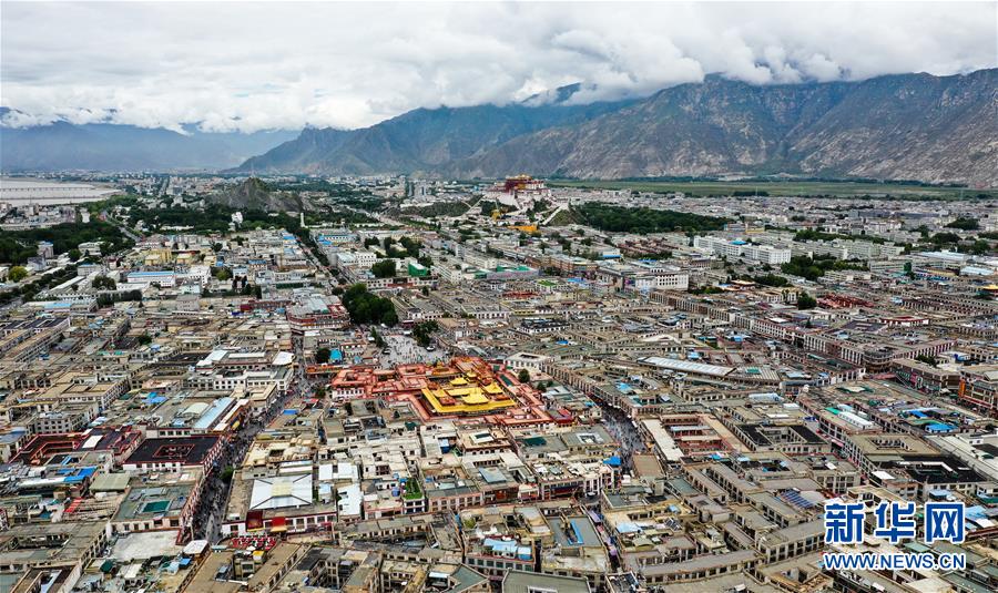8月10日無人機(jī)拍攝的大昭寺和布達(dá)拉宮。新華社記者王建華攝