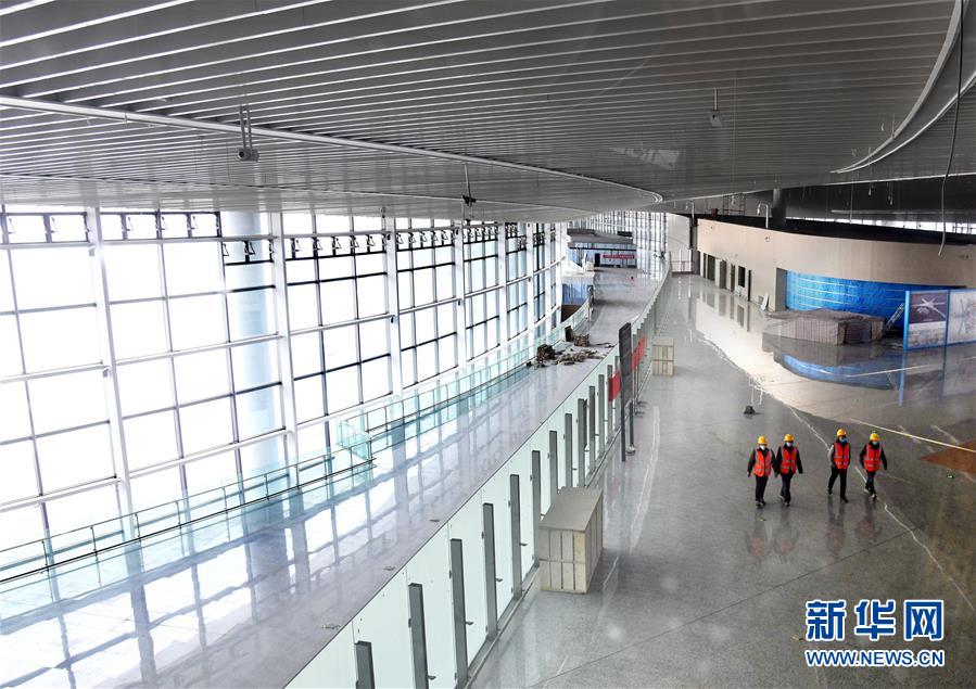 3月25日,幾名工人從建設(shè)中的青島膠東國(guó)際機(jī)場(chǎng)航站樓出發(fā)大廳走過。新華社記者李紫恒攝