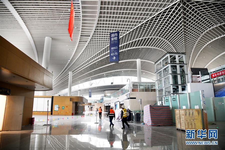 3月25日,兩名工程技術(shù)人員從建設(shè)中的青島膠東國(guó)際機(jī)場(chǎng)航站樓出發(fā)大廳走過。新華社記者李紫恒攝