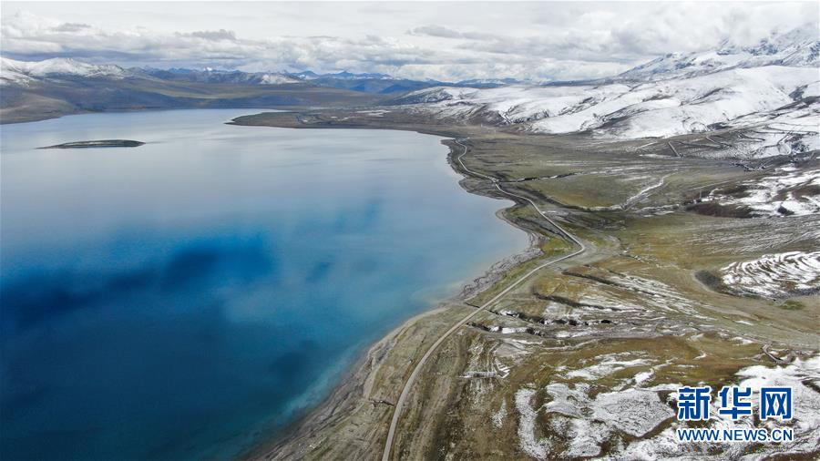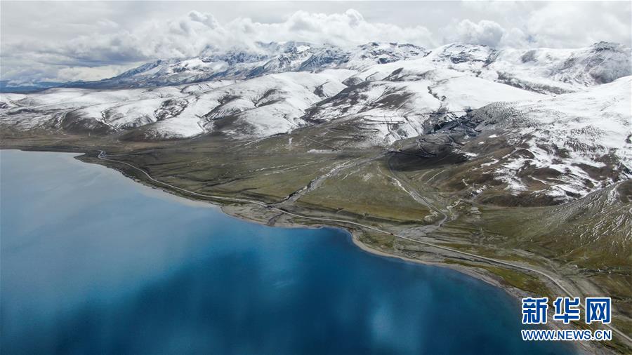 8月31日無人機(jī)拍攝的羊卓雍錯及邊上的307省道。新華社記者晉美多吉攝