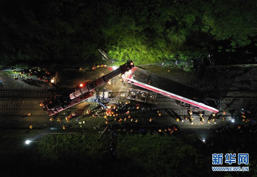3月30日晚,工程機(jī)械在京廣鐵路郴州段脫軌事故現(xiàn)場作業(yè)(無人機(jī)照片)。新華社記者李尕?cái)z