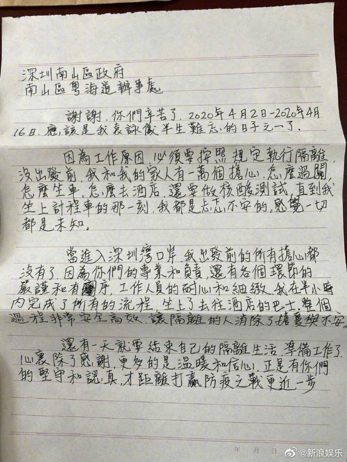 記者了解到,4月2日,袁詠儀因為工作原因,從香港來到深圳,按規(guī)定要到酒店隔離至16日。這段隔離的日子,她表示這是“半生中難忘的日子之一”了。4月15日,她即將結(jié)束隔離,為對這期間辛苦的工作人員表示感謝,她寫了一封信向南山區(qū)政府和“網(wǎng)紅街道”粵海街道辦事處致謝,回憶了當(dāng)時在深圳灣口岸半小時就完成所有流程、前往酒店隔離的過程,點贊了深圳政府一系列安全高效的隔離措施。
