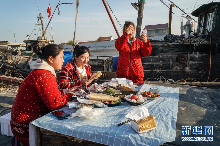 4月22日,馬花雨(下右)、徐紅紅(上)、陸倩(下左)在漁船上拍攝推銷海產(chǎn)品的短視頻。近年來,江蘇省連云港市贛榆區(qū)海頭鎮(zhèn)越來越多的居民開始直播銷售海產(chǎn)品,當(dāng)?shù)貪O船、碼頭和市場上活躍著一批網(wǎng)絡(luò)直播好手。目前,全鎮(zhèn)有3000多戶商家從事海產(chǎn)品直播銷售業(yè)務(wù),形成了集捕撈、加工、包裝、銷售和物流于一體的電商產(chǎn)業(yè)鏈。新華社記者楊磊攝