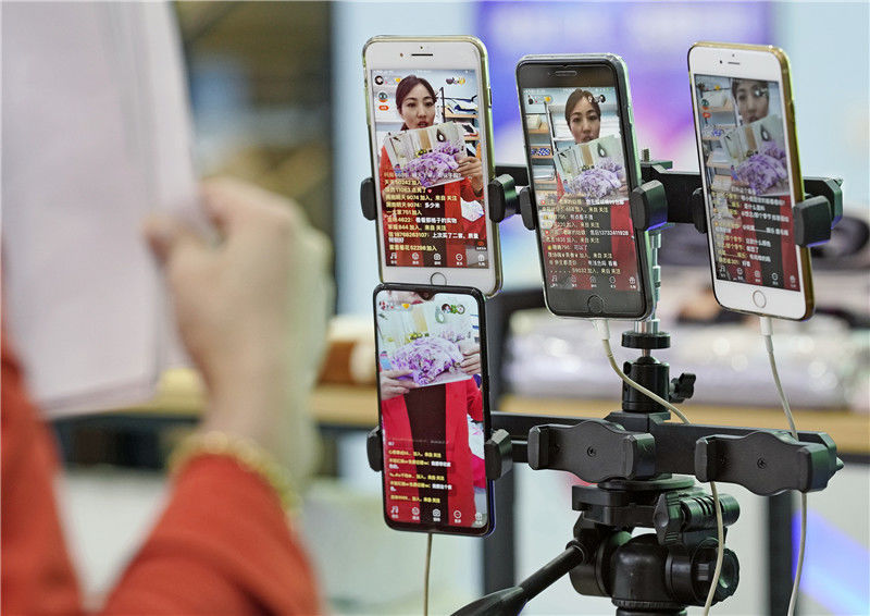 2019年11月11日,浙江金華,義烏北下朱村,一名男子在直播。一名女子在購物。