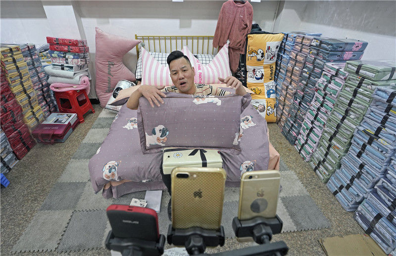 2019年11月11日,浙江金華,義烏北下朱村,在一家床上用品銷售商店,一名男子正在直播。這個網(wǎng)名叫“點(diǎn)子大哥”的男子姓劉,49歲,來自杭州農(nóng)村,有三年半的直播經(jīng)歷。